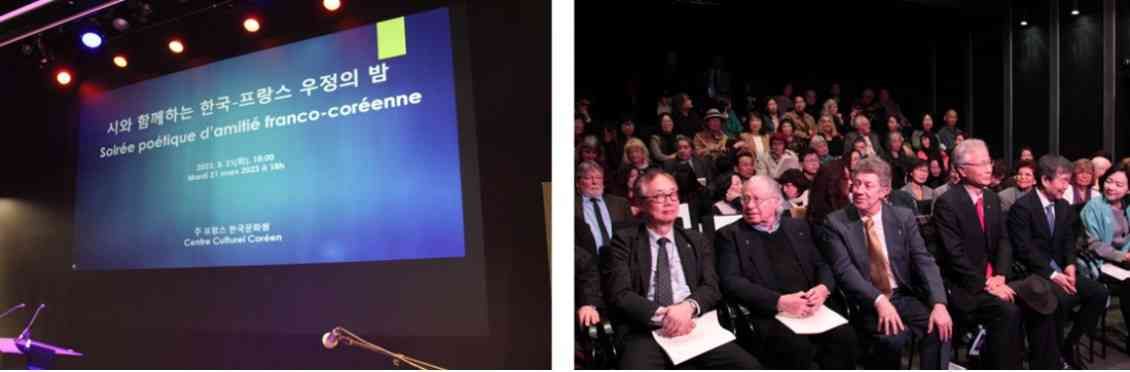 Les associations de poètes des deux pays (SPF et SPSC) ont signé un accord de coopération mutuelle lors d’une Soirée poétique d’amitié franco-coréenne au Centre culturel coréen de Paris, le 21 mars 2023. 100 personnes, dont 60 poètes et une délégation de 24 poètes coréens venus spécialement de Séoul, se sont réunis pour l’événement.